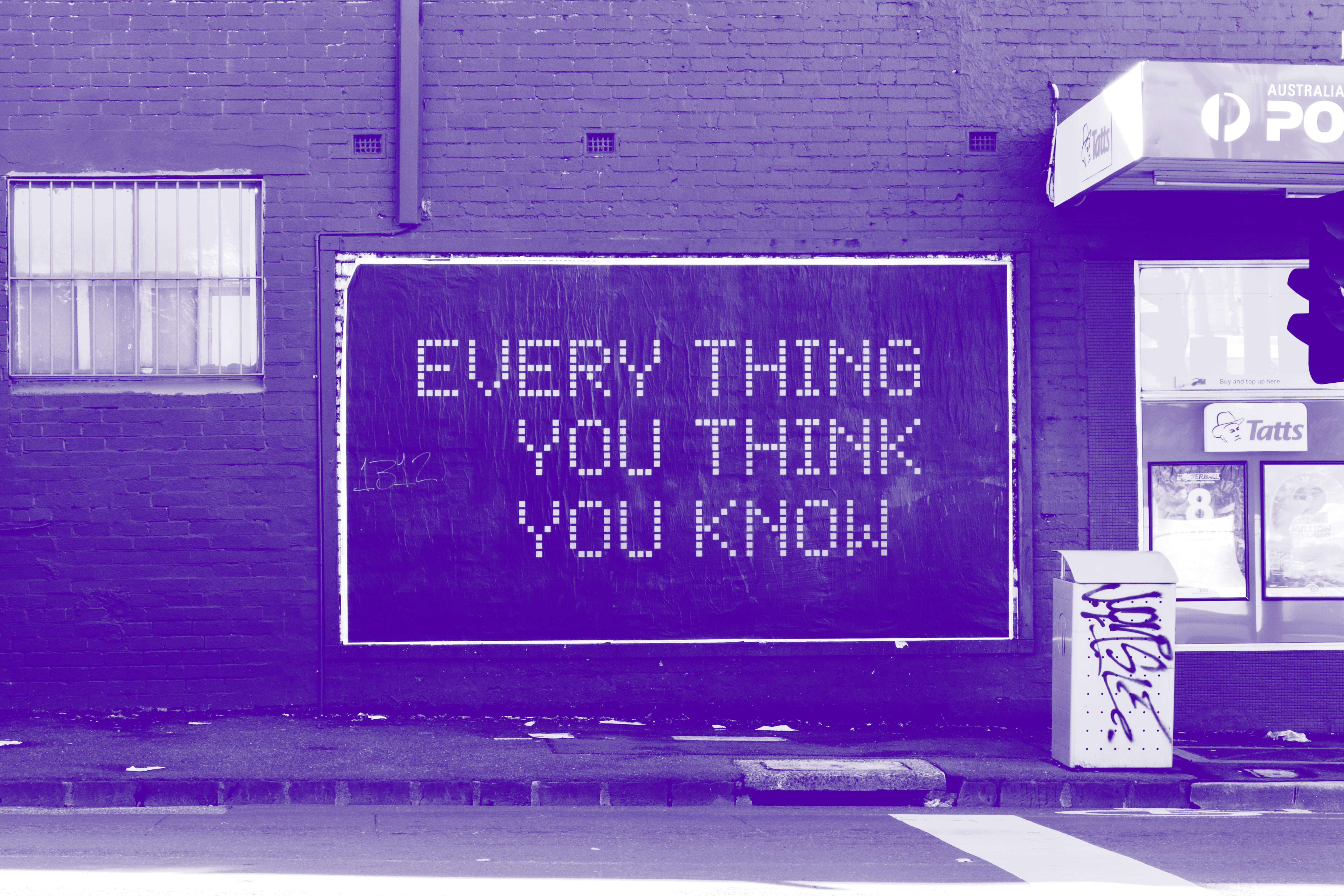 Every Thing You Think You Know is a public billboard erasure project. An unbranded billboard message is slowly redacted, with a letter removed daily over a period of weeks, creating a range of readings and meanings. This unidentified message was designed to be experienced incidentally, to create a moment of confusion or curiosity; a small intensity.